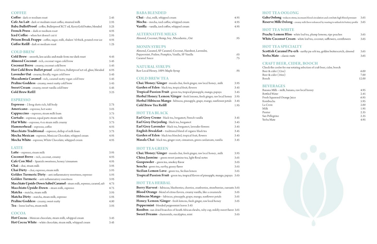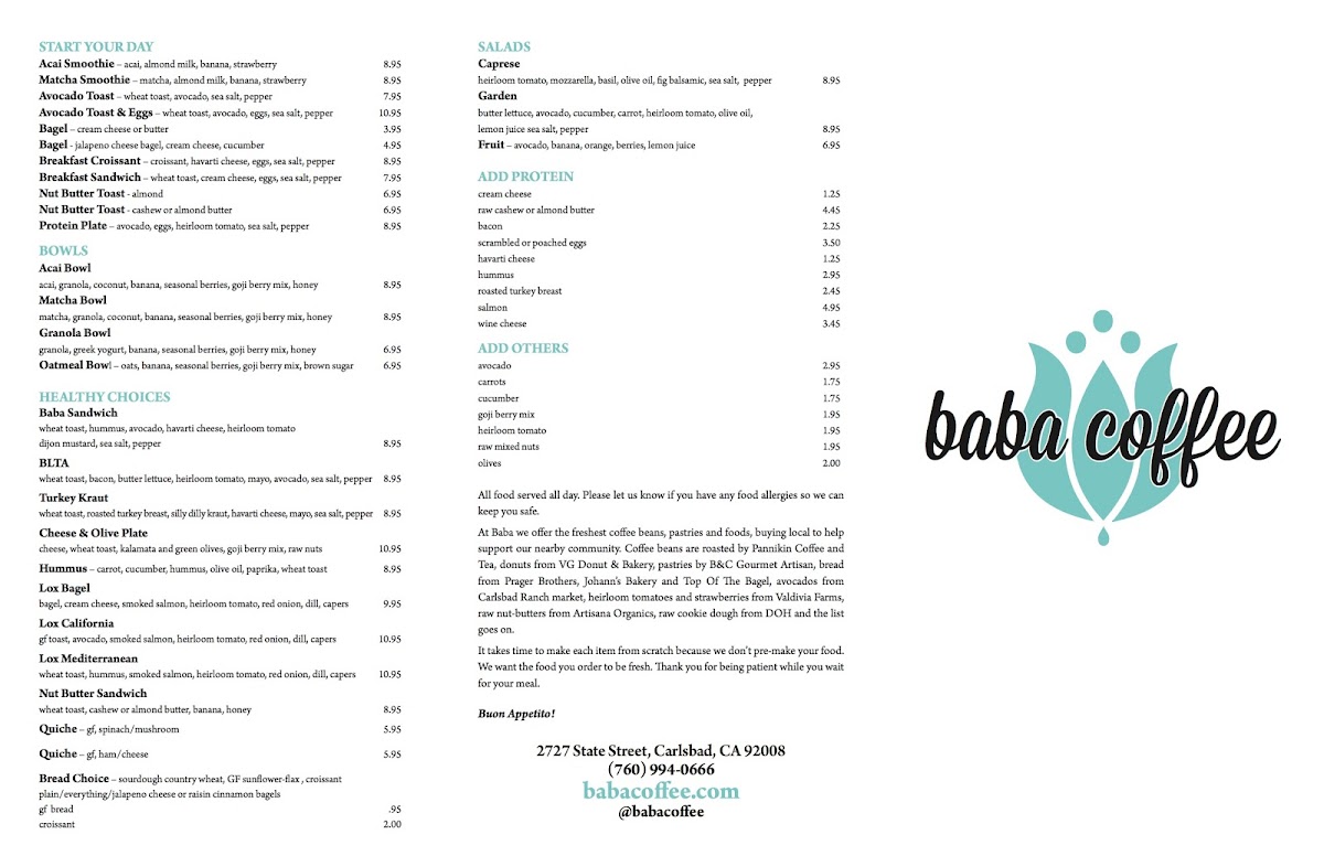 At Baba Coffee, located at 2727 State St #100, Carlsbad, CA 92008, you’re in for a treat with a carefully curated menu that caters to all coffee lovers. The Baba Coffee - Coffee Carlsbad Menu offers a variety of rich, flavorful options, from classic espresso-based drinks to innovative seasonal specials. Whether you're in the mood for a smooth cappuccino or an iced latte, there's something here for everyone. Pair your coffee with a fresh pastry, and you’ve got the perfect start to your day or a delightful afternoon pick-me-up. The relaxed atmosphere of Baba Coffee makes it the ideal spot for catching up with friends or simply enjoying some quiet time with your favorite brew.